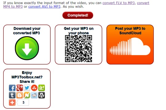 MP3Toolbox.net is a free online service that lets you convert mp3 to video format and vice-versa. It can provide output format in mp4, flv, and in avi form and also allows to post output video to YouTube and Facebook. Moreover, it lets you post output mp3 to your SoundCloud account. That’s why it is a bit different than other audio video converters.