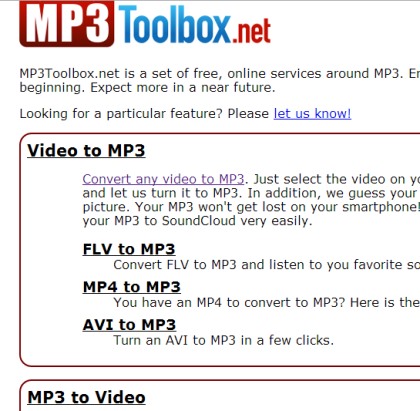 MP3Toolbox.net is a nice audio video converter service but having limited options at present. It would be more beneficial for users if it could provide more output formats to choose from and also the ability to adjust bitrate, output quality, frame rate, channels etc. You can try this service on your own and can access its homepage using the link present below: