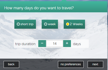 - Time Duration (for days): Enter the time fame for trip in terms of number of days like 2 days, 1 week, 2 weeks etc.