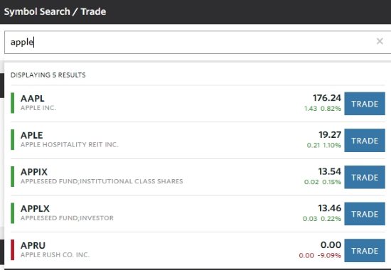 Right now you have no holdings in your portfolio. To start trading you need to go to the top of the screen and search for a stock that you want to buy. For example, I searched for Apple and the below screenshot shows the suggestions which the website gave.