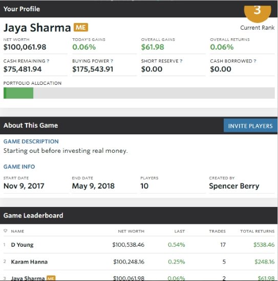 Once you join in a game you will see a overview screen. This screen will show you your net worth, your buying power, your gains, your portfolio allocations, etc. On the left side of the screen you can see that now you can participate in the group discussions as well. Below your profile you can see the info about this particular game and leaderboards of this game.