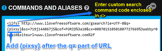 Step 2.2 The URL from the previous step serves as a template for the custom search command script for its website. Now, copy this entire URL into the script editor, and replace the text after the part q= in the URL with the placeholder {pixsy}. In addition to this, prepend your custom search URL to this URL, enclosing it in <>. Check out the screenshot below for reference: