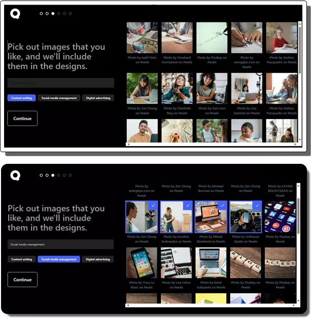 - Proceed and in the next step, it will ask you to pick images for the different sections. So, first select a section name and then pick images from the gallery on the right side. Do it for other sections. Here it generates/suggests images for the different sections using AI on the fly.
