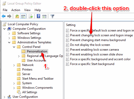 Step 3: Now on the right-side, you will see a Prevent changing lock screen and logon image option. Double-click on it. See the screenshot above.