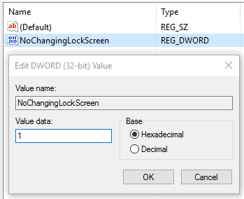 Step 4: Putting the value data as ‘1’ for NoChangingLockScreen will disable lock screen wallpaper change. So, do the same. Double-click that value and add “1” in its Value data.