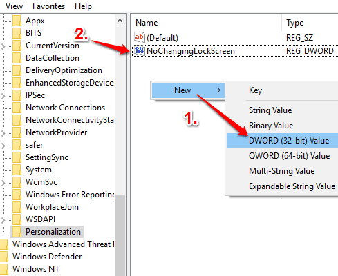 Step 3: Create a new DWORD (32-bit) Value under Personalization key. You can create it by right-clicking on the right-side → New → DWORD (32-bit) Value. When the DWORD value is created, name it as “NoChangingLockScreen“.