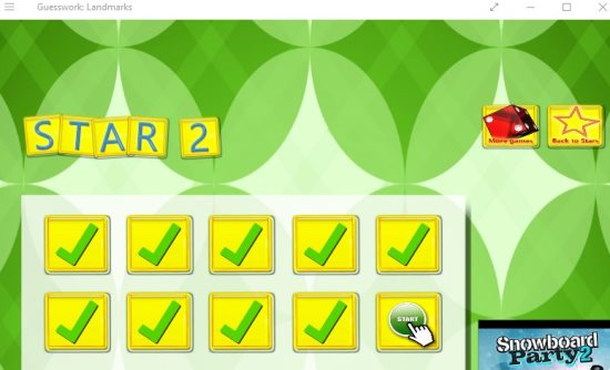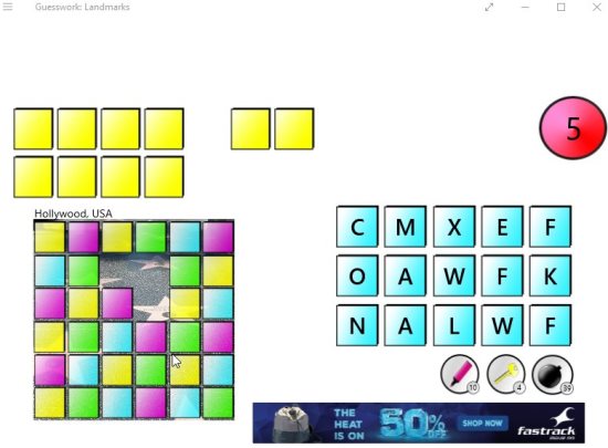 Guesswork Landmarks is a free Windows 10 picture guessing game. In this game you have to correctly guess the landmark given in the picture. The picture is also not fully revealed to you, it is covered with small square blocks and each block has to be clicked to reveal the picture. The fun thing is that you only get to take away 10 block from the hidden picture and then guess which landmark is shown in the picture.