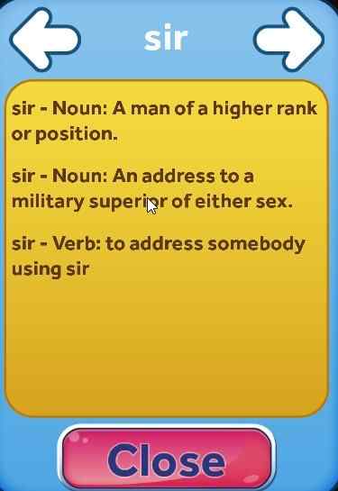 The game board will look like the screenshot above. Just remember that you have to find at least one six lettered word to move on to the next round. If you can’t find a word, just click the twist button to scramble the letters a bit. This might help you in forming a new word. The last button shows the last button that you formed. You can also check out the definition of a word by clicking on it, as can be seen in the screenshot below.