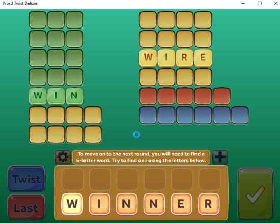 Word Twist Deluxe is a free Windows 10 word puzzle game app where you have to form words from given letters on the game board. The main aim of the game is to find all the words that you can form with the given six letters. You have to find at least one six lettered word to move on to the next round in the game.