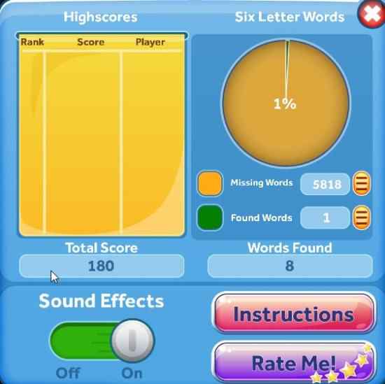 From this window you can see your high scores, percentage of six lettered words you have formed, turn the sound effects on or off.