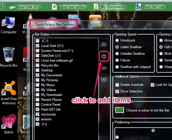 Click on ‘Q’ icon and Options window will open up. Using this window, you will be able to select system defined folders (like control panel, My Pictures, My Videos, etc.) or can add your own custom items. Use ‘+‘ button to add your own items and up/down arrow button to rearrange added items. Apart from this, you can set bar color as well as its position.