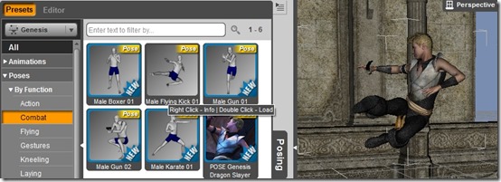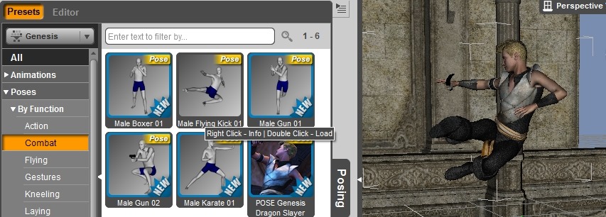 - To add a static pose to the characters, click on the “Poses” and then double click on the pose to apply.