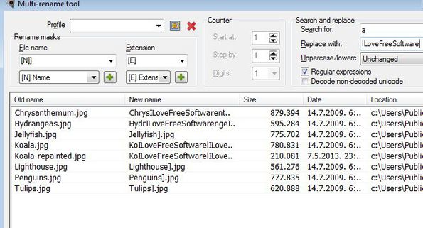 For the bulk file renamer to work, you first need to select the files that you want renamed from the list in the panes and then select Commands >> Multi-rename tool from the main menu in the top left corner. Search and replace can be used on file names, we for example changed the letter A from file names with ILoveFreeSoftware, look at top right corner of the image above.