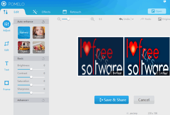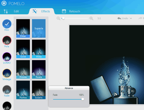 POMELO (beta) is a free photo enhancer software that helps to edit images as well as retouch your images. It comes with a special feature to compare original and enhanced image together, so you can easily find out the difference. It provides multiple effect types to enhance the images, such as: film, pola, vintage, Fade, B&W, and LOMO. Each effect type contains multiple styles to make your image more beautiful.