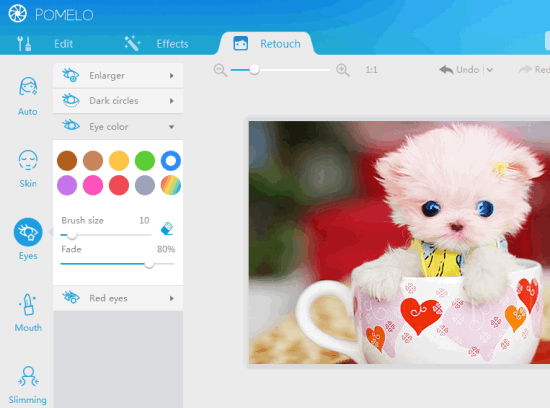 This option is especially for girls as it helps to enhance beauty of your photo (mainly face). Using this option, you could change your eyes color, skin color, can make skin smoother, remove dark circles (if any), make teeth white, and apply slimming effect wherever needed. Auto enhancer feature is also available here that provide presets to use.