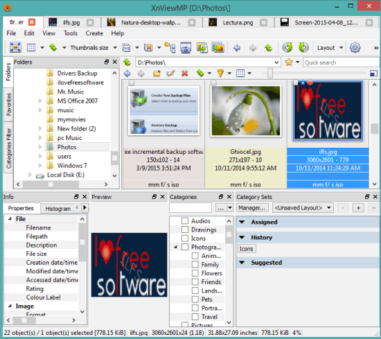 XnViewMP (enhanced version of XnView) is also a great alternative to Picasa. You can organize photos by arranging them into various preset categories or by creating the new categories. You also have feature to mark photos as star, set photo priority, and add rating to images. This also helps to easily filter and sort photos. A navigation pane is also provided to easily access a folder containing your photos.