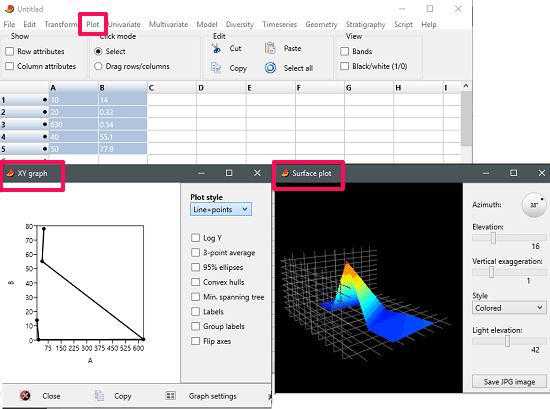 In the spreadsheet, you can add the data and then choose any graph from the “Plot” menu. After that a window will pop up with your graph in it. In the graph window, you can customize the XY labels, units of the graph, font, font size, etc. You can see the below screenshot, showing the surface and an XY graph for a random data.