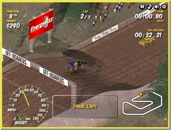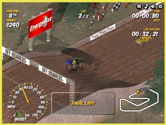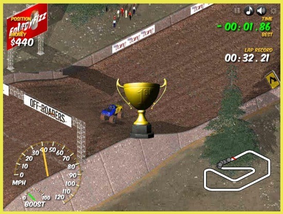 The sound produced during the game motivates you to Boost your speed and overtake the other drivers. The track has sharp turns and huge humps that gives you a real off-road adventure effect, while playing the game.
