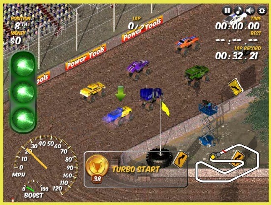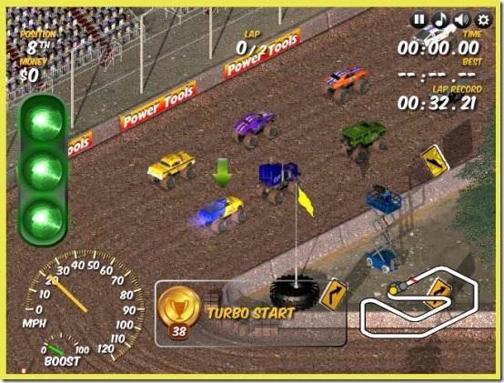 As you select you car, it further shows you your race track map along with number of laps, lap record. You just set yourself and get ready for the race. As the signal turns Green, just press W or Up arrow along with the space bar to begin with Turbo Start and achieve bonus credits (not mentioned in the help game play options).