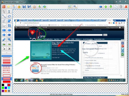 I have worked with many good screen capturing tools like Gadwin Printscreen and quickscreenshots, but what I like best in HotShots is its support for adding annotations to the screenshots using an advanced built-in editor. The tools provided by this annotation editor are really amazing. You can add arrows, numbers, circles, lines, etc., and annotate your screenshots with colorful objects. Apart from that, this annotation tool also lets you highlight part of screenshots or zoom the selected area. The great thing is that every object appears clean on screenshot background and makes the image looks visually pleasing.