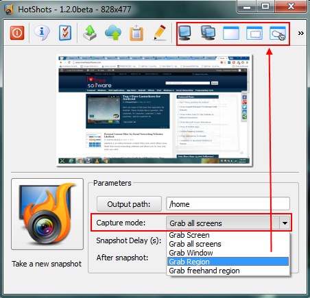 HotShots starts as a small window listing some tools on top, a blank area for displaying the screenshot preview, a capture button, and some screenshot parameters.