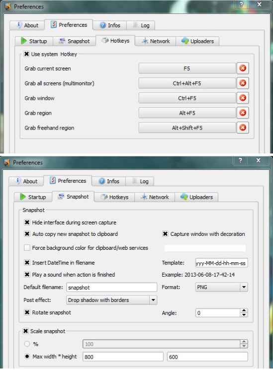 To use hotkeys, you can open the “Preferences” panel and specify hotkey options for each image capturing mode. Other setting options include autostart with system, playing capture sound, inserting date and time in filename, autocopy to clipboard, adding shadow and border to images, rotating screenshots or scaling them to fixed width and length, etc.
