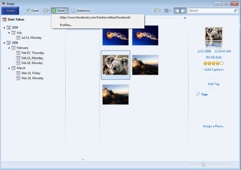 Posting images to social networks is also available, add your Facebook account, authenticate, select the image that you want to upload and then click on Share. When you select the account to which you wish to upload, a window should pop up where you need to select the album if it’s Facebook and upload should start. You get all of these feature completely free, if you’re using Windows 7, download Snaps and start managing your photo collection on a whole new level.