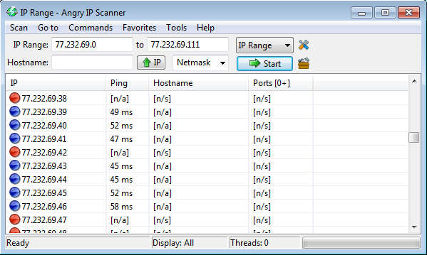 The IP address range scan showed us which addresses are online, but there were no special hotnames detected. This was an online scan, if you were to scan a local area network, for which Angry IP Scanner was initially intended for, you’ll receive different results.