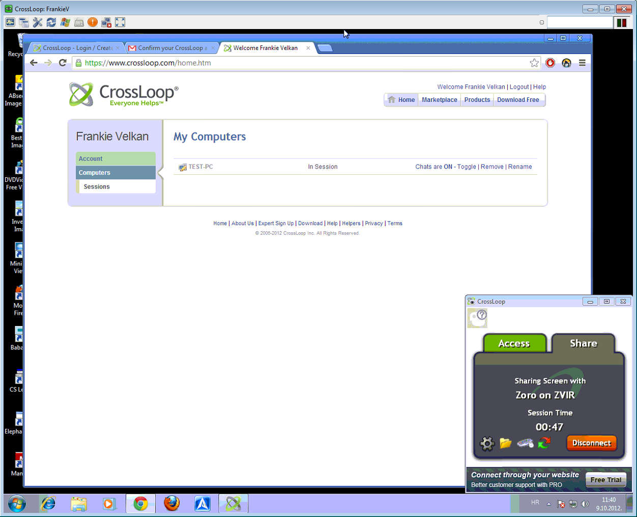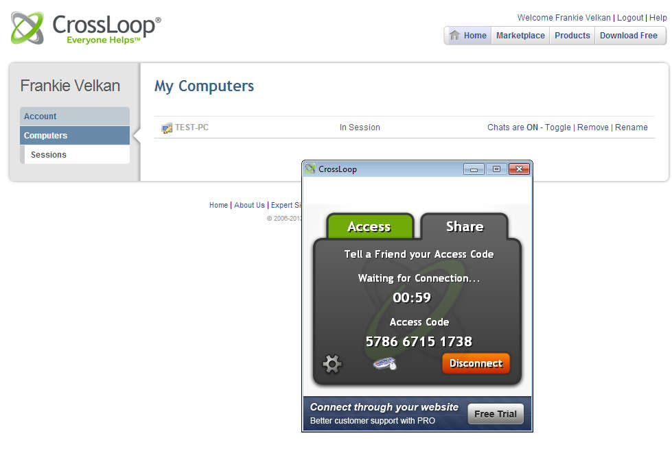 What you see on the image above is the CrossLoop website together with the desktop client. This is how computers are registered to your account from where they can be managed and accessed remotely anywhere in the world, as long as there is an active internet connection present of course. Free accounts are allowed to have only one connection, to one remote computer, which is enough for home use, if you need to provide support to a friend or a family member, or if you’re just interested in testing out how CrossLoop works before implementing it in your business.
