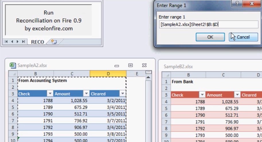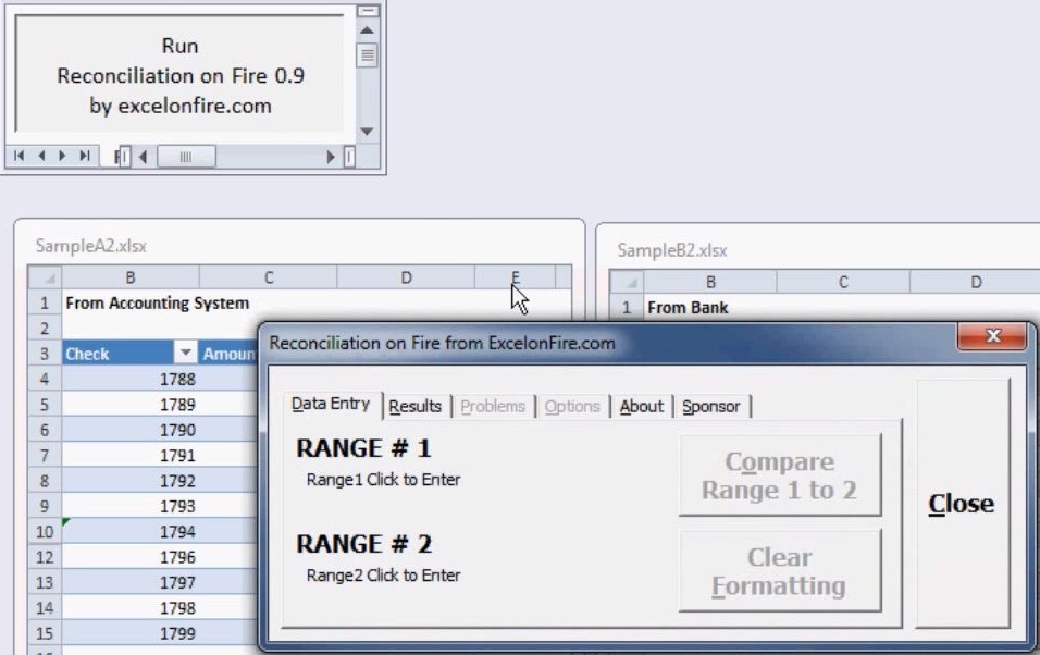 Open up both of the spreadsheets that you want to compare and of course Reconciliation on Fire spreadsheet. Macros have to be activated in Excel, otherwise this free data comparison utility will not work. Click on the Run button, and then fill out both of the ranges from each of the spreadsheets where you need to compare data.