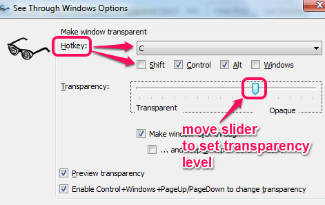 - You can select any desired key combination to generate hotkey for making foreground window transparent.