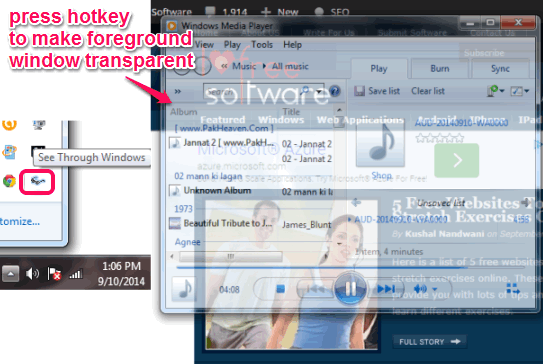It will start running in system tray. Now you can make any active window transparent just by using the default hotkey ‘Shift+Ctrl+Z‘. Active window will become transparent to default level immediately and you can see the background window.