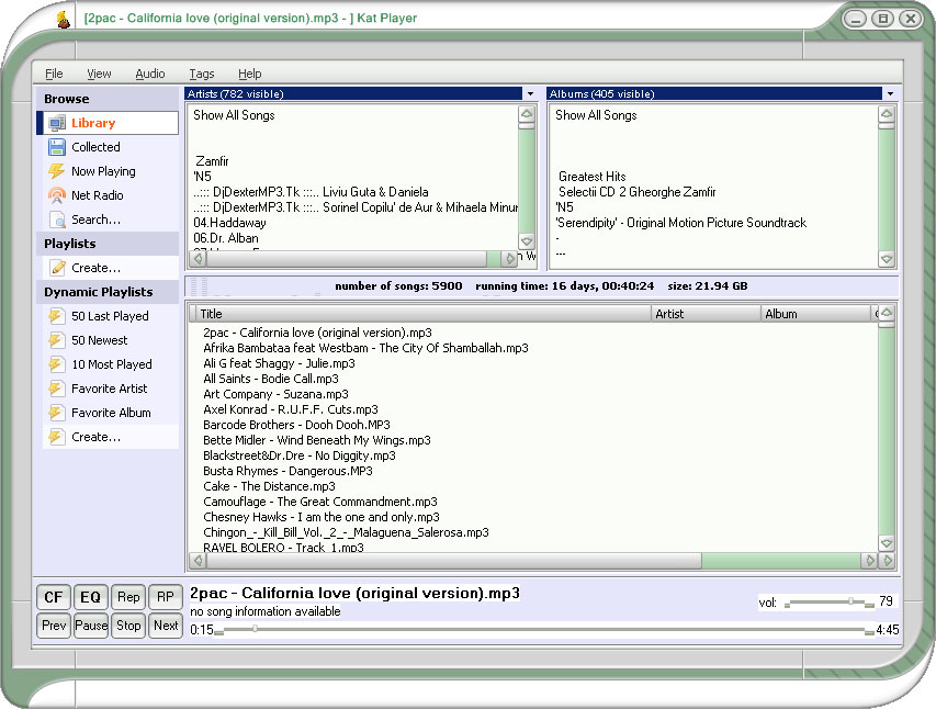 We previously presented you Kat programs suite made of Kat CD Ripper, and Kat MP3 Recorder, this time we are going to put some light on another great Kat application, the Kat Player. Kat Player is a very good music manager, using it you can listen to the music you have on your PC. Various formats are supported by Kat Player, formats like MP3, MP4, MPC, FLAC, OGG, WAV won’t cause any trouble to this player.
