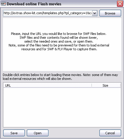 SWF and FLV Player looks pretty nice. The main window is quite uncluttered, and the toolbar comes up only when you take your mouse over it. Before I played a Flash file, I had to download some Flash file. For that, I just went to File -> Downlod Flash movies. This opens a small window in which you need to pass the URL from where you want to download the file. This Flash movie downloader will discover all the Flash files at that URL, and will give you option to open them. One thing I didn’t like is that Free version does not lets you save Flash files to your computer. Instead, it will direcly open the downloaded file.