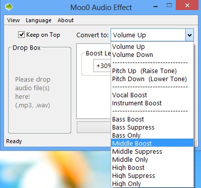 Moo0 Audio Effect is a free audio editor for Windows. Like the name of it suggests, the main feature that’s offered is the ability to add several different effects to songs and audio tracks that you process. Volume can be increased, pitch changed, various boosts (bass, middle, high) are just some of the effects that can be applied to audio tracks. Simplicity is another great thing about this free sound effect processor.