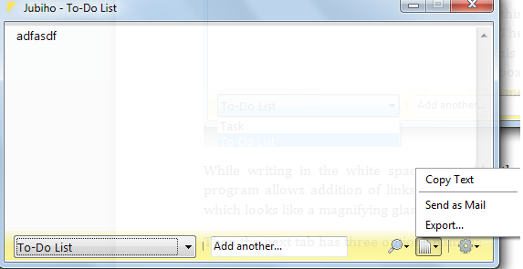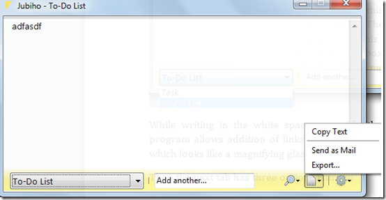 The copy text option simply helps you copy whatever you have entered in the space provided for typing. By clicking on the Send as Mail option you can directly send the whole note through your id to any person. Finally by using the export option you can save the note in an .rtf format to the desired place.