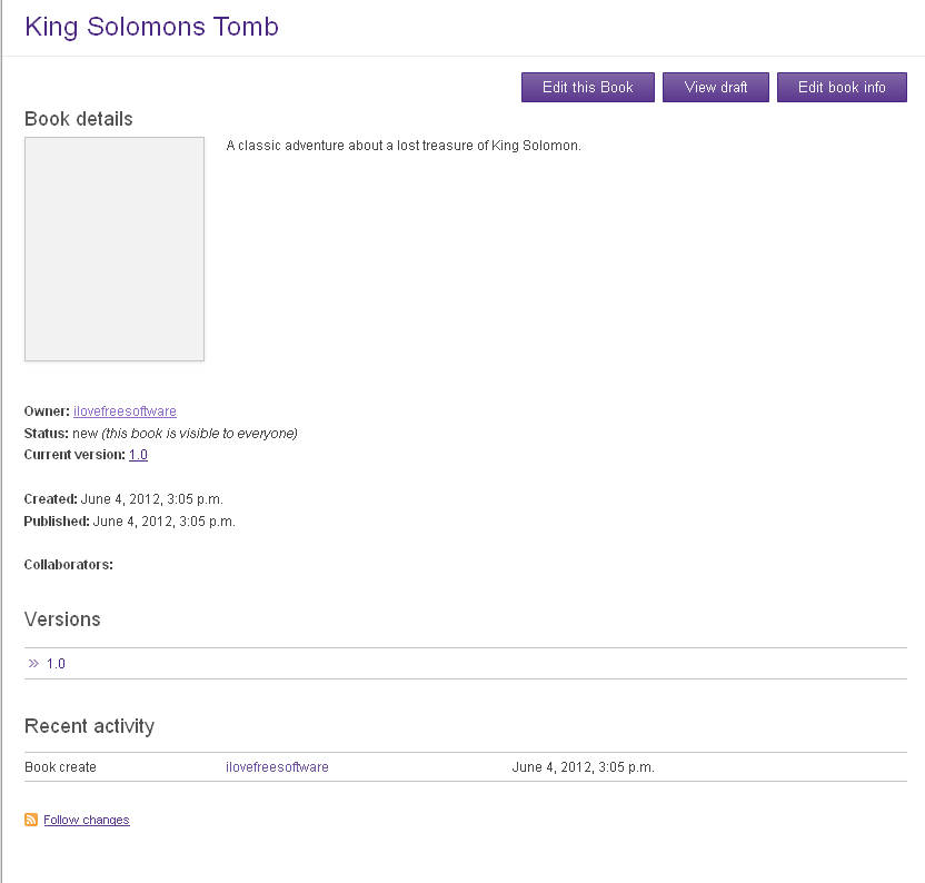 Here you have to enter the usual, name of your book, a short description, select what kind of license the book will have, add a cover image and finally you can choose if you want to make the book public, so that it can be found by others online and join in on its development. After you’re done, the book will appear in your account and after that the only thing that’s left is to actually write it :D.