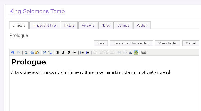 You can’t have a book without a Table of contents, so naturally this is the first thing that you need to create in order to be able to start witting the book. Sections are kind of like containers, Chapters are the thing which is important to add. With a chapter added the Edit button appears, and after clicking on it the book witting can start: