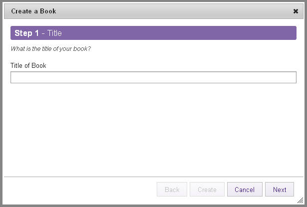 To create a new book you need to click on the Create New Book option which you can see on the first image above, after doing that a new book creation wizard will pop up: