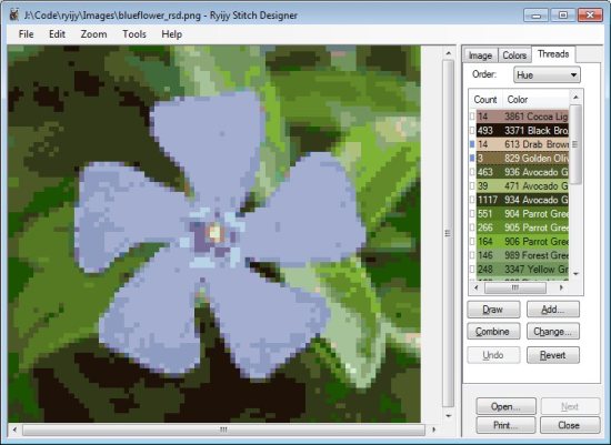 Ryijy Stitch Designer is a free software for designing cross stitch patterns. This software lets you design cross stitch or rya rug patterns from an image. It is a very simple to use program.