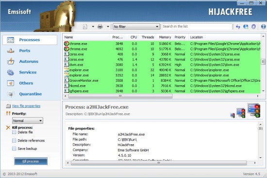 Each module opens in a separate window and works separately. With Emergency Kit Scanner, you can perform quick scan, smart scan, deep scan , or custom scan. With Commandline Scanner you can scan system files through command prompt. With HiJackFree module you can monitor active processes, ports, services, and delete or quarantine the suspicious ones. And the Blitzblank module is to be used with caution, since it allows you to dump or remove objects by executing commands.