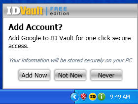 After you’ve created the PIN number, right after that you will receive a notification where it says that you simply open up in your browser the website where you want your account protected by this online ID theft protection software, and the program will automatically pick up on what you’re doing and offer you to save the info. But after we’ve tried that in Firefox, left ID Vault running in the background while logging into Gmail, nothing happened, so we decided to try in Internet Explorer and sure enough ID Vault popped up with add account message.