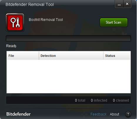 Simplicity would be the word that best describes Bitdefender Rootkit Remover. In the top right corner of the screen there’s a Start Scan button, and that’s pretty much it when it comes to controls and menus. Down below you get an empty list where the infections, if you’re unlucky enough to find any, are gonna be displayed.