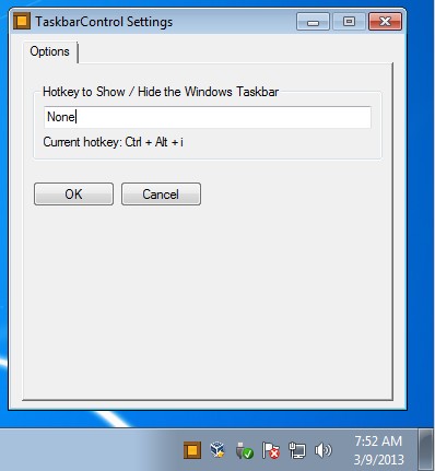 The only thing that you should tweak, or better yet, the only thing that you can tweak is the keyboard hotkey which you’re gonna use to hide the taskbar. Right click on the system tray icon and select Settings to open up the window that you’ve seen on the image above. By default the hotkey should be CTRL+ALT+I. This be changed by clicking on the shortcut field to activate it, pressing the key combination that you’re interested in using and after that clicking OK to save.