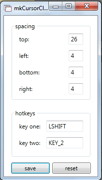 Now when you see the icon of mkCursorClip on your taskbar you know that you are ready to use the application. So for checking out the settings and changing the hotkey you need to right click on the icon from the taskbar and select settings. In the settings window you have the options to change the spacing from the default set dimensions for a particular window. At the bottom you have the hotkeys changing option where you can put your favorite keys as the ones you prefer to activate this program.