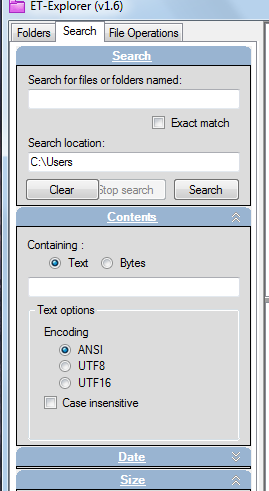 Once you click on the folders you will be presented with all the drives and you can click on the appropriate drive to select the files you require. By clicking on the search tab you can specify the name of the file you are searching. Once you type the name of the file you want to search you can click on exact and you will be provided with the file you were searching. There is also the file location tab where you can specify the name of the drive where you are searching this file and in the text or bytes option you can click on the one which suits your search.