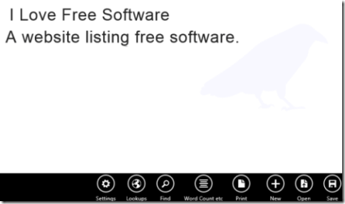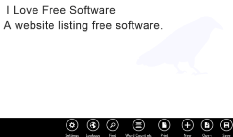After launching the app, you will find different options on the bottom of the screen: Settings, Lookups, Find, Word Count, Print, New, Open, and Save.