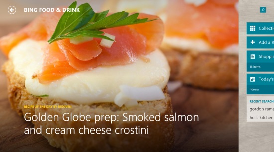 Bing Food & Drink is a Windows 8 Bing Food app. You can use this app to find recipes, Plan meals, make shopping lists, and do some other kind of stuff related to food and Drinks. The app will also provide you with tips and techniques which would be helpful for you in cooking.