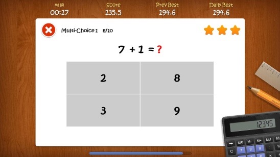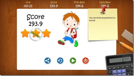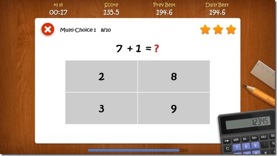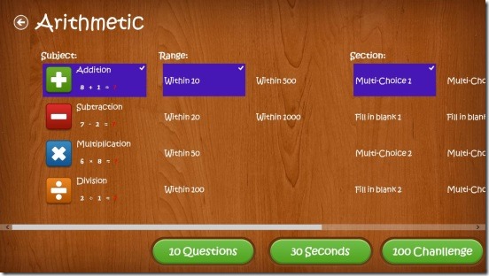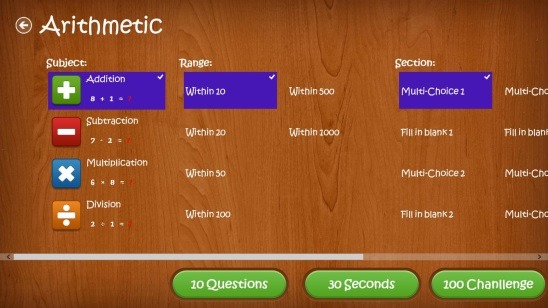 Simply click on any one of the groups, and this directs you to that group screen, which further consists of different types of problem according to that group. For example: Arithmetic has simple Addition, Subtraction, Multiplication, Division as Subjects, option to choose Range of numbers, and Sections. The sections consists of Fill in Blanks, Multi Choice, Comparisons etc. Simply select the desired Subject, Range, and Section, and click on 10 questions, 30 seconds, or 100 Challenge buttons at the bottom side of screen. After each practice session you get scored in 3 stars in a session result page, with 3 being best, and 1 being worst.