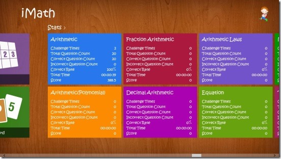 And, when you scroll in the Main Screen using mouse wheel; you can see your math stats in the app. These stats are according to the groups that are mentioned above. You can use these stats to find out what are your strengths, and where you need improvements.